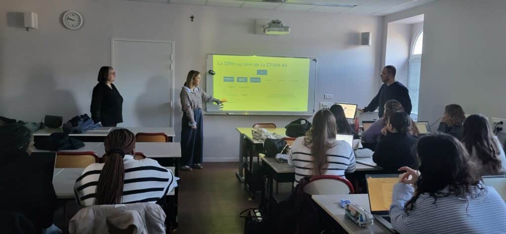 La CPAM de Nantes est venue à la rencontre de la classe de 2ème année de BTS Services et Prestations des Secteurs Sanitaire et Social (SP3S) pour une intervention sur le Pôle Ressources Humaines, animée par Mesdames Marion Charrier et Béatrice Coquerant, et Monsieur Romain Dussart.